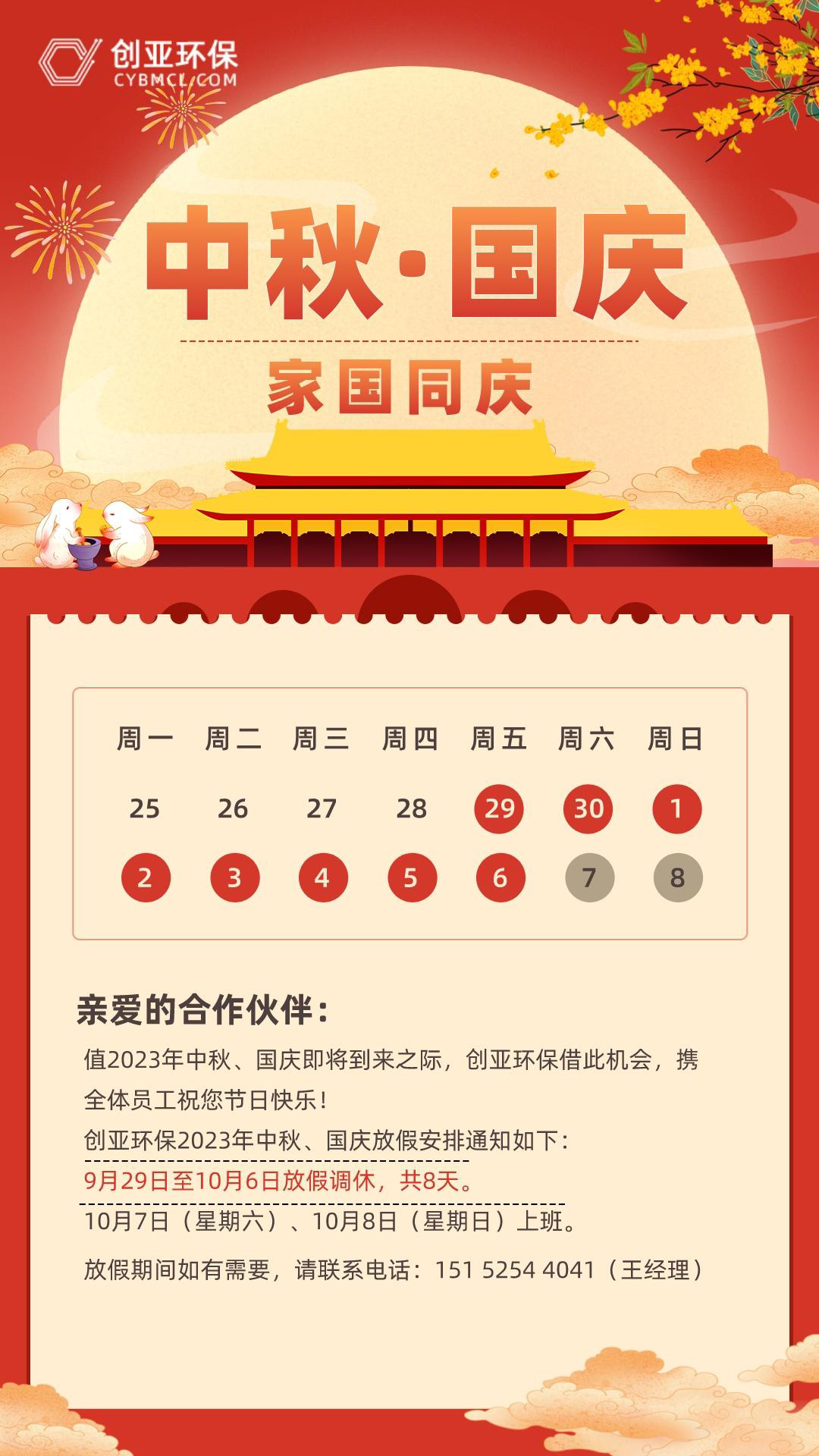 值2023年中秋国庆节日来临之际,创亚环保借此机会携全体员工恭祝亲爱的合作伙伴节日快乐。